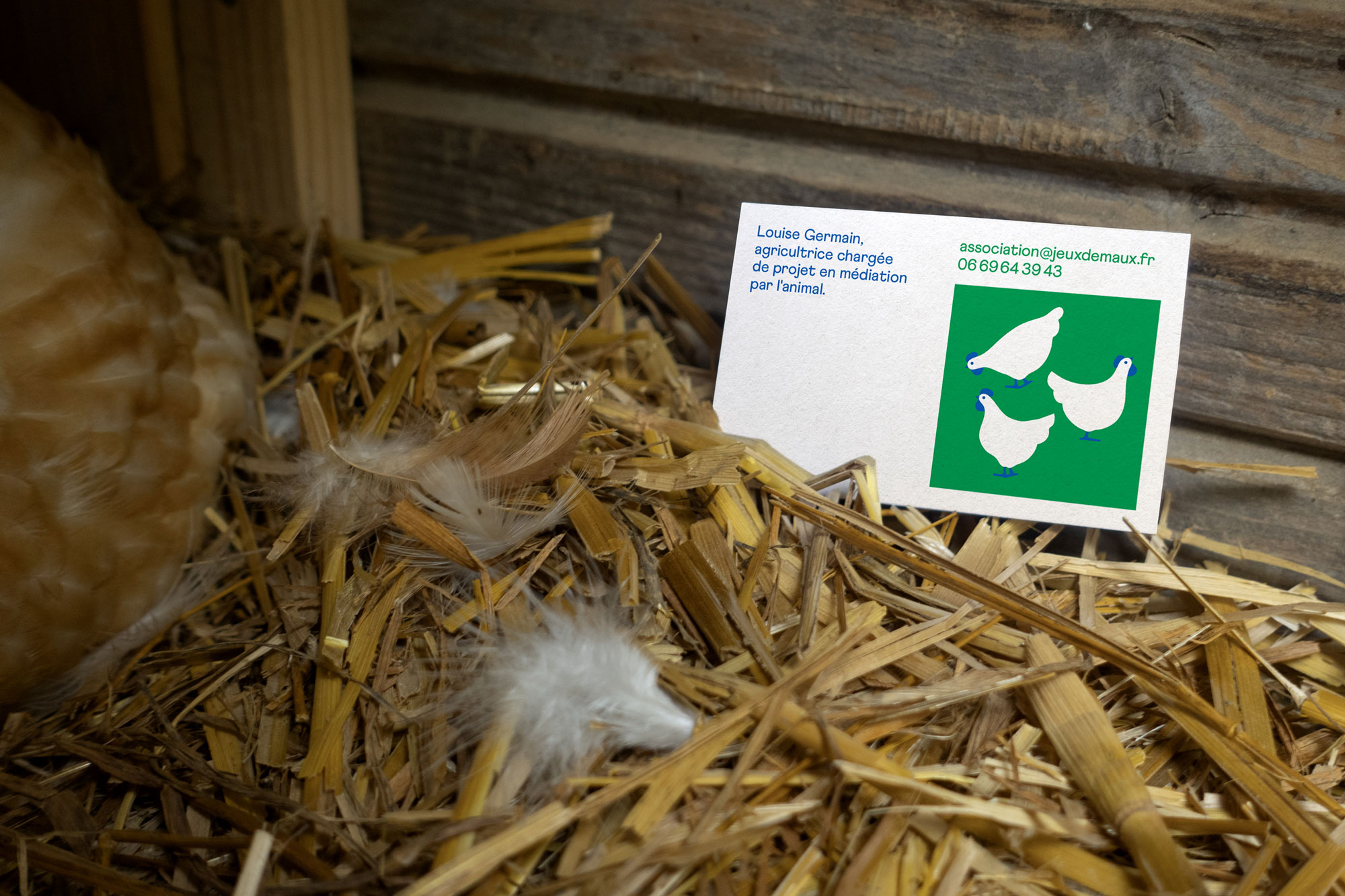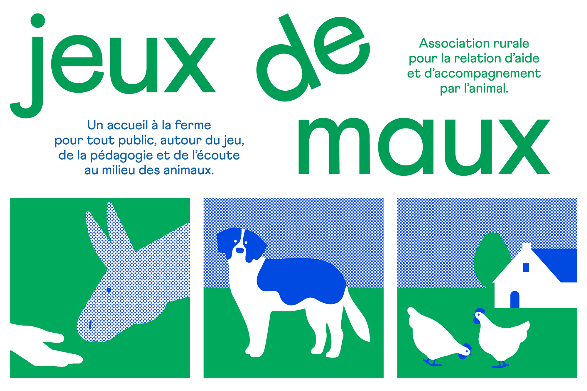 Louise, agricultrice et fondatrice de Jeux de maux réalise les ateliers de médiation avec son équipe : le chien Gloria, les ânesses Câline et Galipette, une bande de poules, quelques vaches et les deux lapins. Comme ces ateliers, l’identité visuelle de Jeux de Maux se devait d’être ludique, accessible, plurielle. Le logo n’a donc pas de forme fixe : tantôt les trois mots qui le composent se suivent sagement, tantôt ils jouent à saute mouton. Une série d’illustration déployée sous forme de vignettes permet également de présenter les animaux, les ateliers et leurs bienfaits.