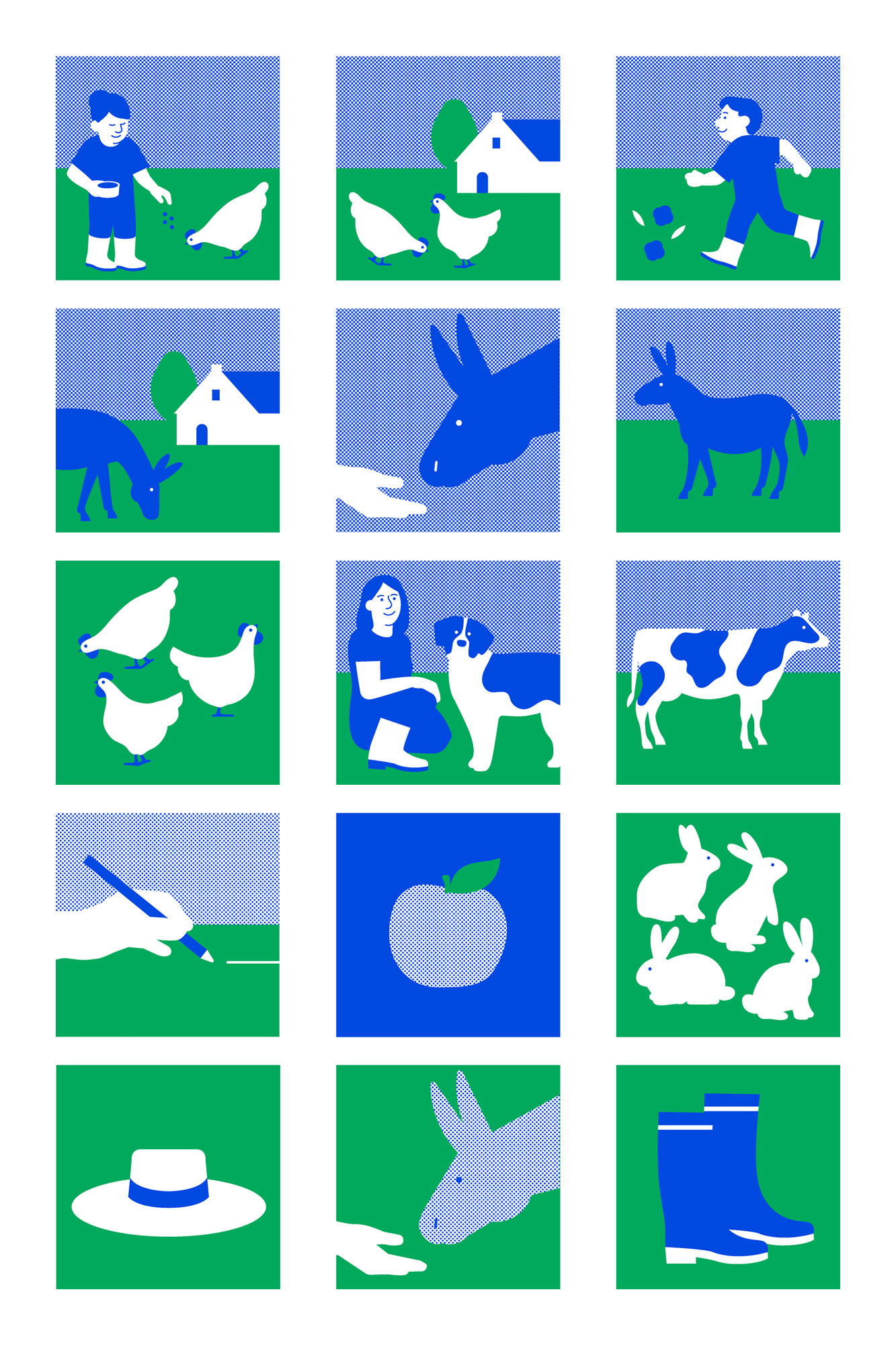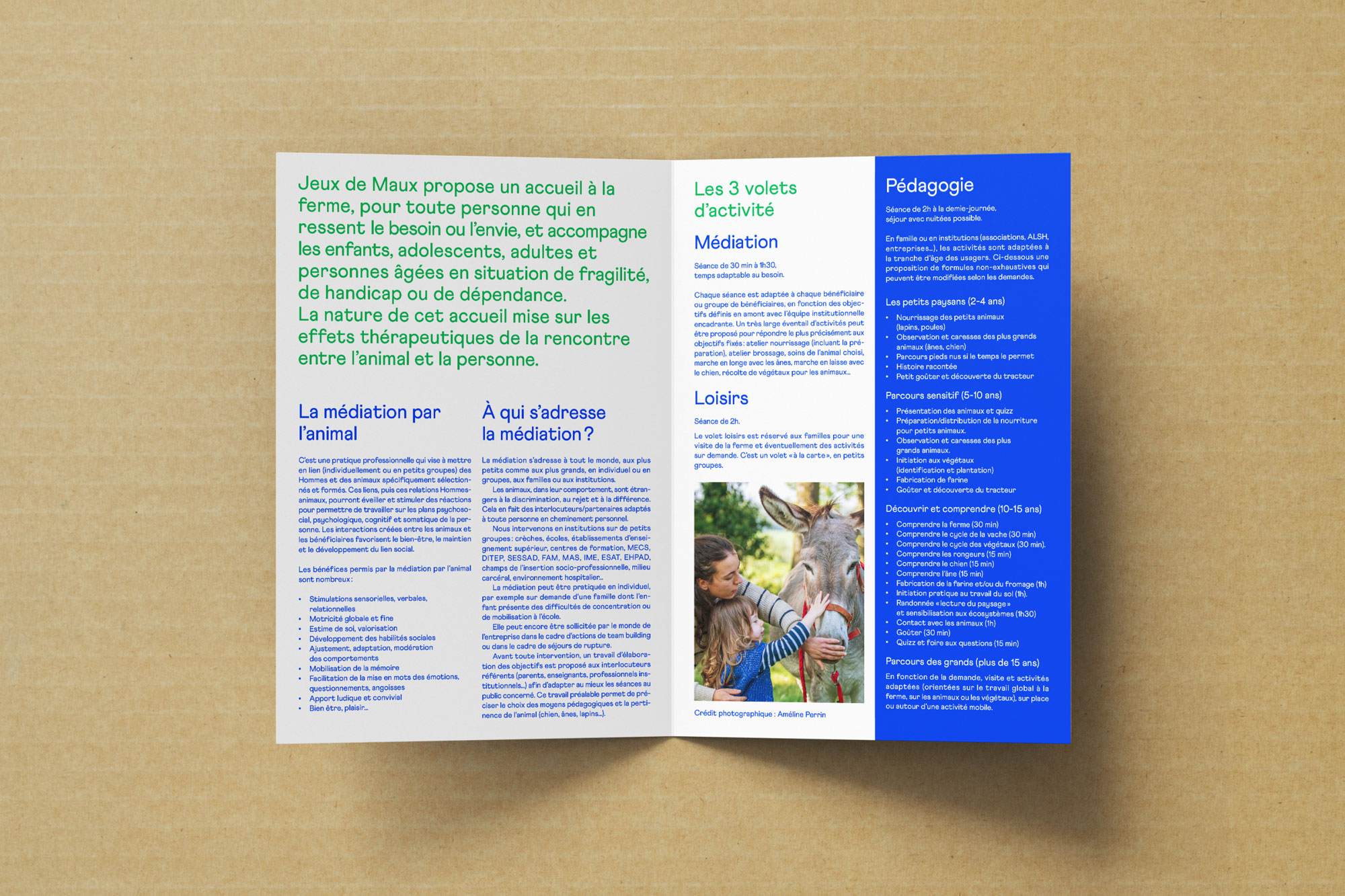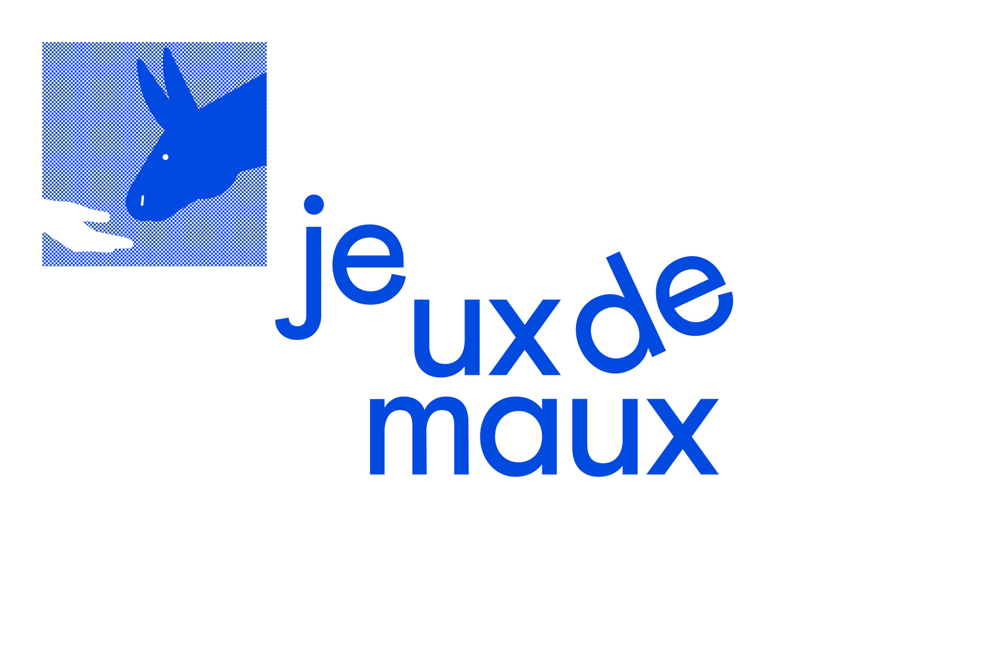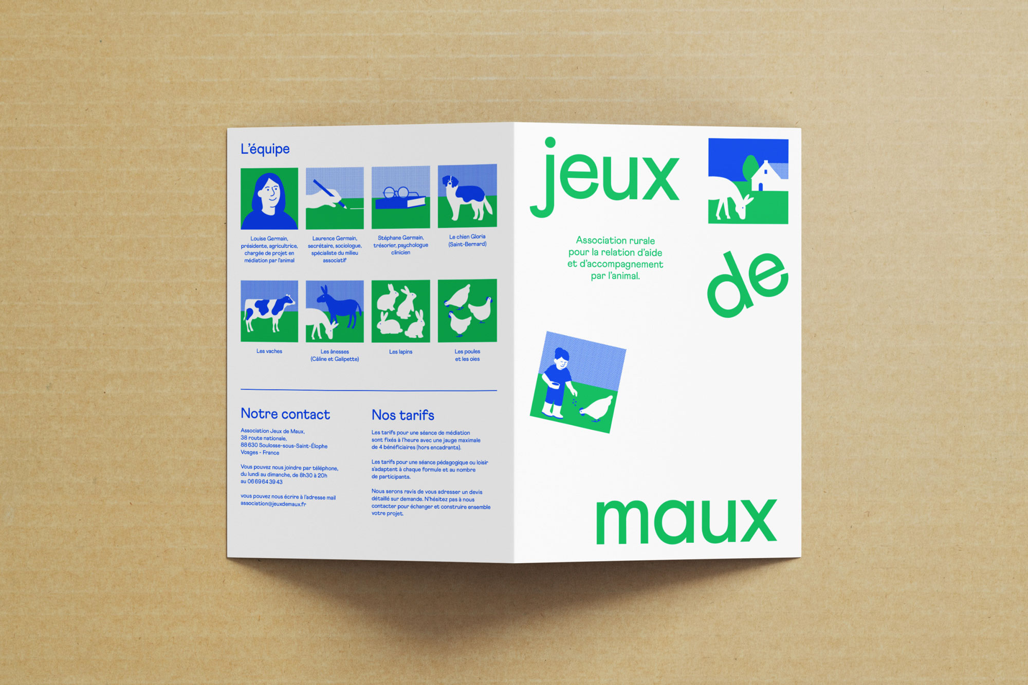 Louise, agricultrice et fondatrice de Jeux de maux réalise les ateliers de médiation avec son équipe : le chien Gloria, les ânesses Câline et Galipette, une bande de poules, quelques vaches et les deux lapins. Comme ces ateliers, l’identité visuelle de Jeux de Maux se devait d’être ludique, accessible, plurielle. Le logo n’a donc pas de forme fixe : tantôt les trois mots qui le composent se suivent sagement, tantôt ils jouent à saute mouton. Une série d’illustration déployée sous forme de vignettes permet également de présenter les animaux, les ateliers et leurs bienfaits.